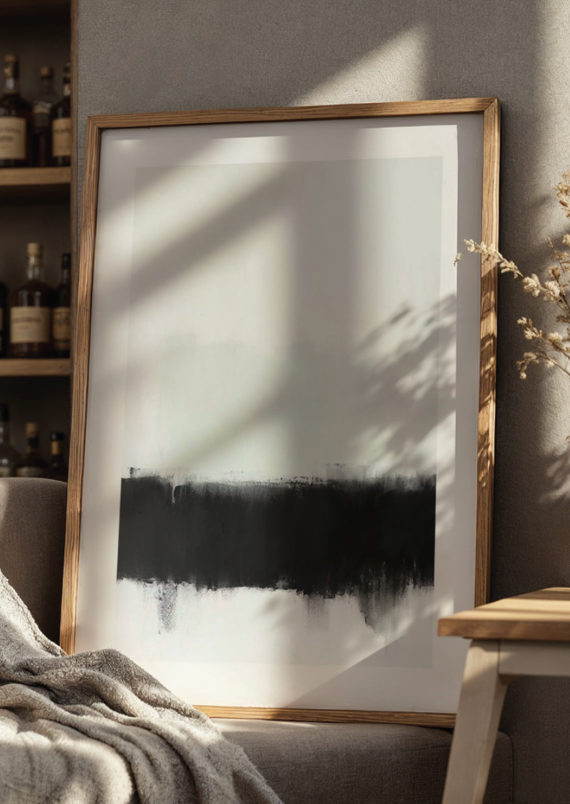 Coloca cuadros o una colección de cuadros que abarquen el ancho de tu sofá más grande. Busca cuadros de dimensiones amplias o combina varios de menor tamaño para crear un conjunto armónico.